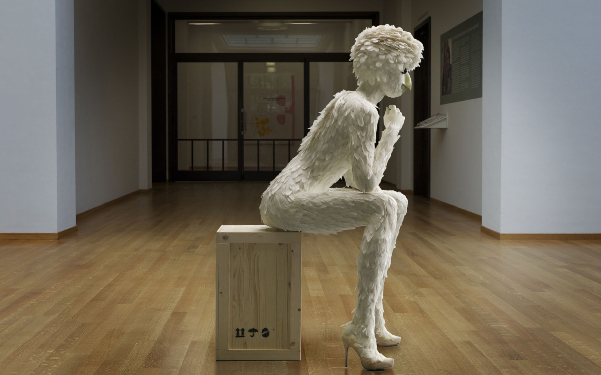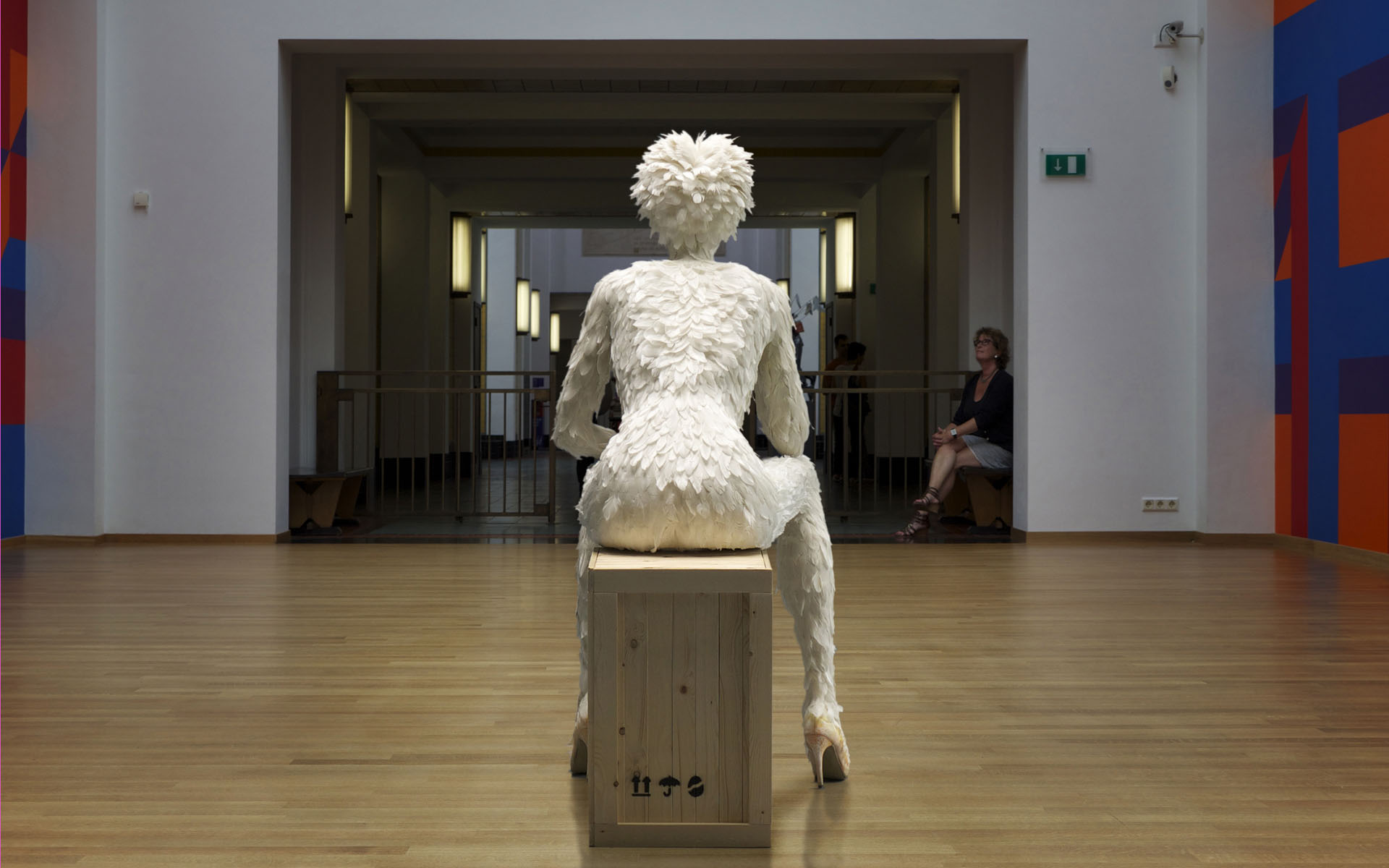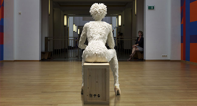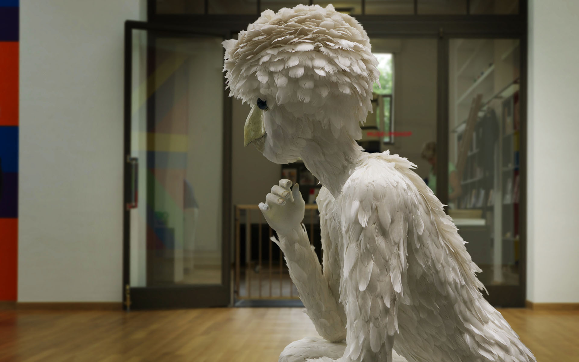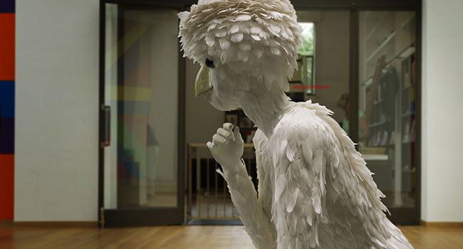 Terwijl ik het eenzijdige gesprek volg – tussen Hans en een mogelijke koper van een schilderij – merk ik dat ik weer naast de Broedster sta. Die veertjes zijn niet zomaar op haar kruintje geplakt, het is verdorie een kapsel! Het moet een heidens karwei geweest zijn om de duizenden spierwitte veertjes op grootte en kleur te sorteren en op precies de juiste ‘groeiwijze’ op het figuur te bevestigen.