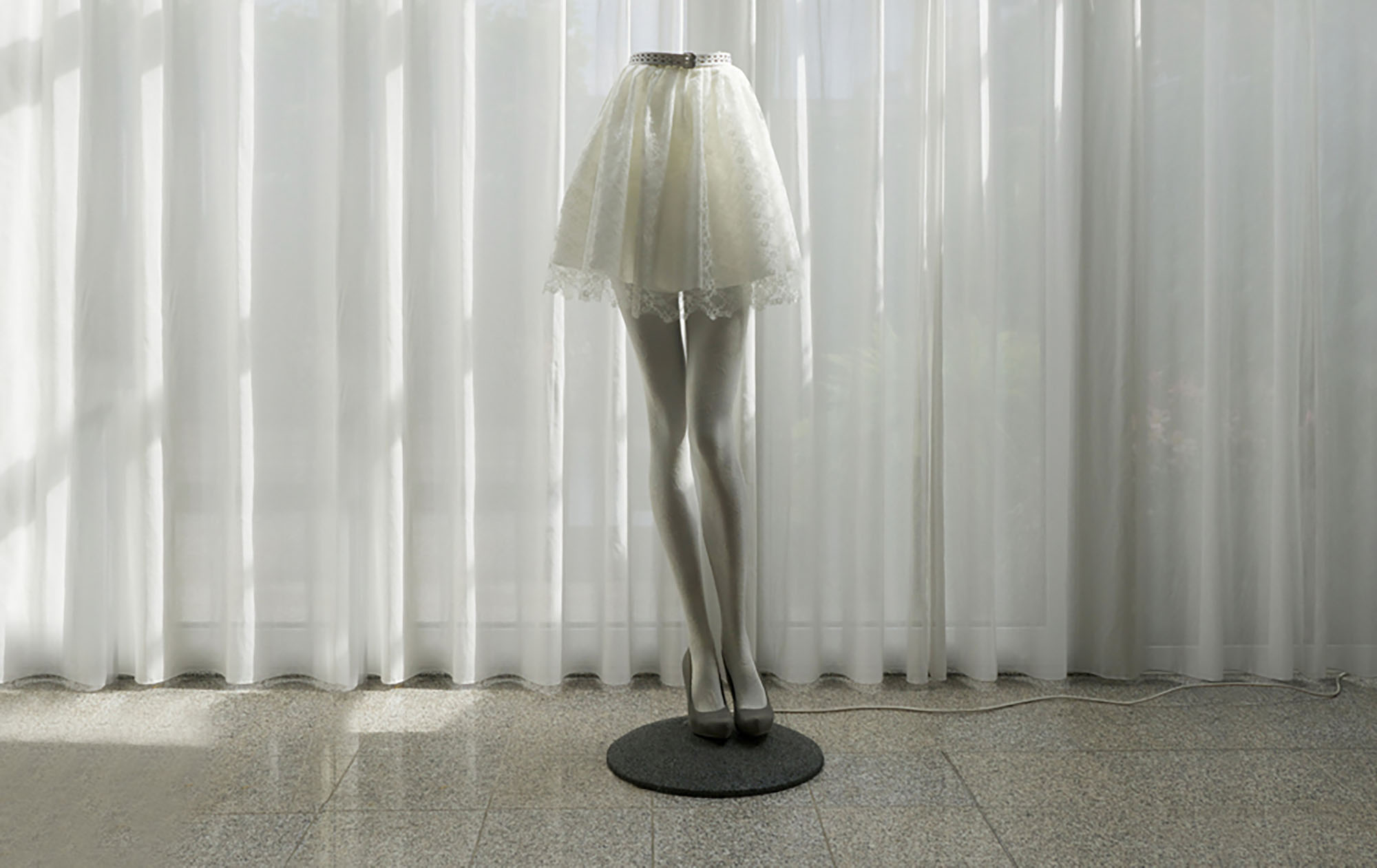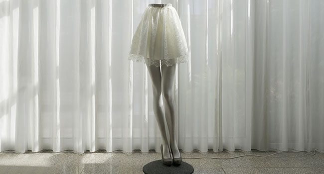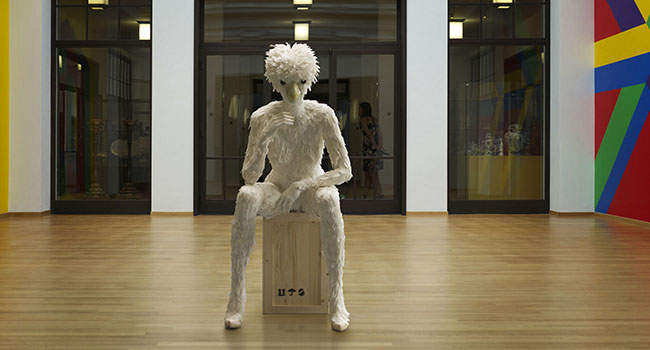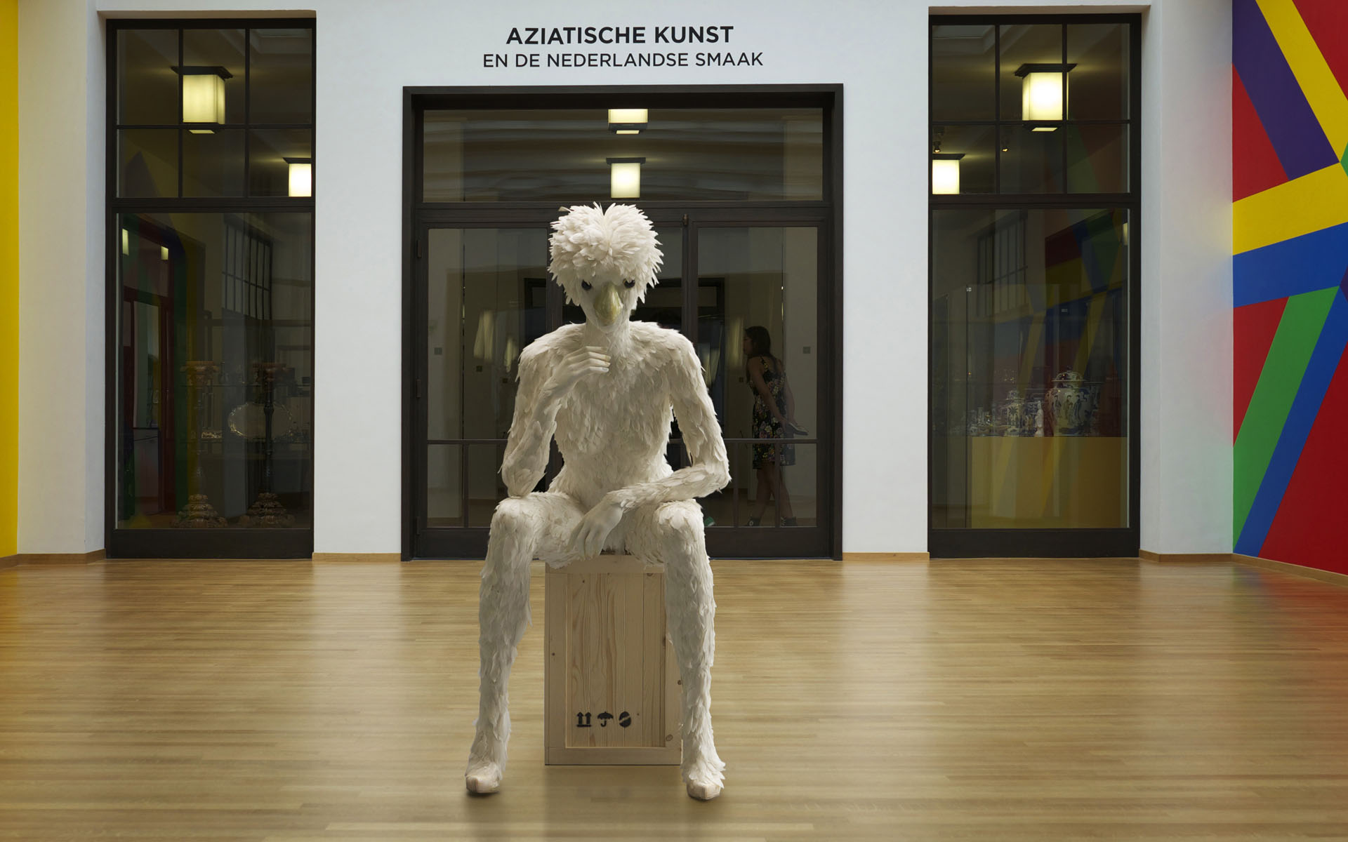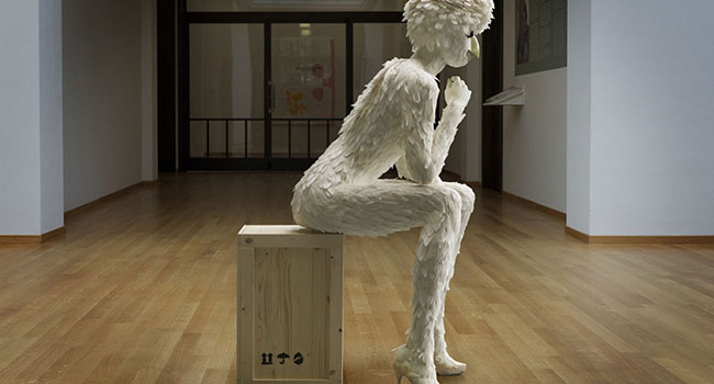 Terwijl ik het eenzijdige gesprek volg – tussen Hans en een mogelijke koper van een schilderij – merk ik dat ik weer naast de Broedster sta. Die veertjes zijn niet zomaar op haar kruintje geplakt, het is verdorie een kapsel! Het moet een heidens karwei geweest zijn om de duizenden spierwitte veertjes op grootte en kleur te sorteren en op precies de juiste ‘groeiwijze’ op het figuur te bevestigen.